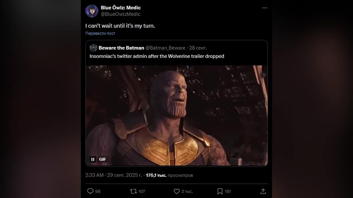 Комьюнити-менеджер Santa Monica Studio с ником @BlueOwlzMedic в соцсети X отреагировала на пост о «Росомахе» фразой: «Не могу дождаться, когда наступит моя очередь». Эта короткая реплика мгновенно набрала около двух тысяч лайков и вызвала бурное обсуждение среди фанатов.