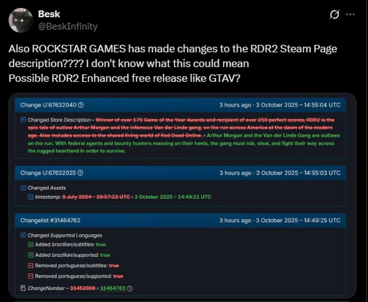 Новый повод для спекуляций дала сама Rockstar Games, обновив описание игры в Steam впервые с релиза. В обновлённой версии исчезли упоминания о наградах и онлайн-режиме, который недавно получил новый контент в июле.