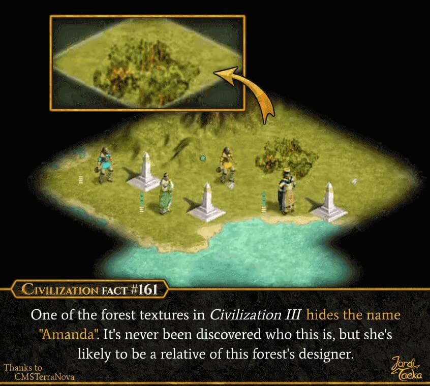 Фанат серии Civilization уже больше полугода делится редкими и малоизвестными фактами о 4X-франшизе. Один из последних постов оказался посвящён любопытной пасхалке в Civilization 3 — в одной из текстур леса спрятано имя "AMANDA", составленное из деревьев. Личность Аманды долгое время оставалась загадкой, но архивы фанатских форумов помогли раскрыть тайну.