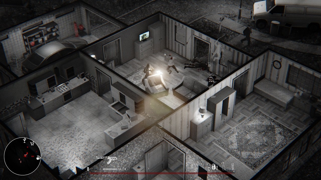 - Графика и стиль: нуарная стилистика, черно-белый мир с яркими красными пятнами крови, создаёт контрастный и мрачный визуальный стиль. Динамическое освещение порой мерцает, но это лишь добавляет атмосферы хаоса.
