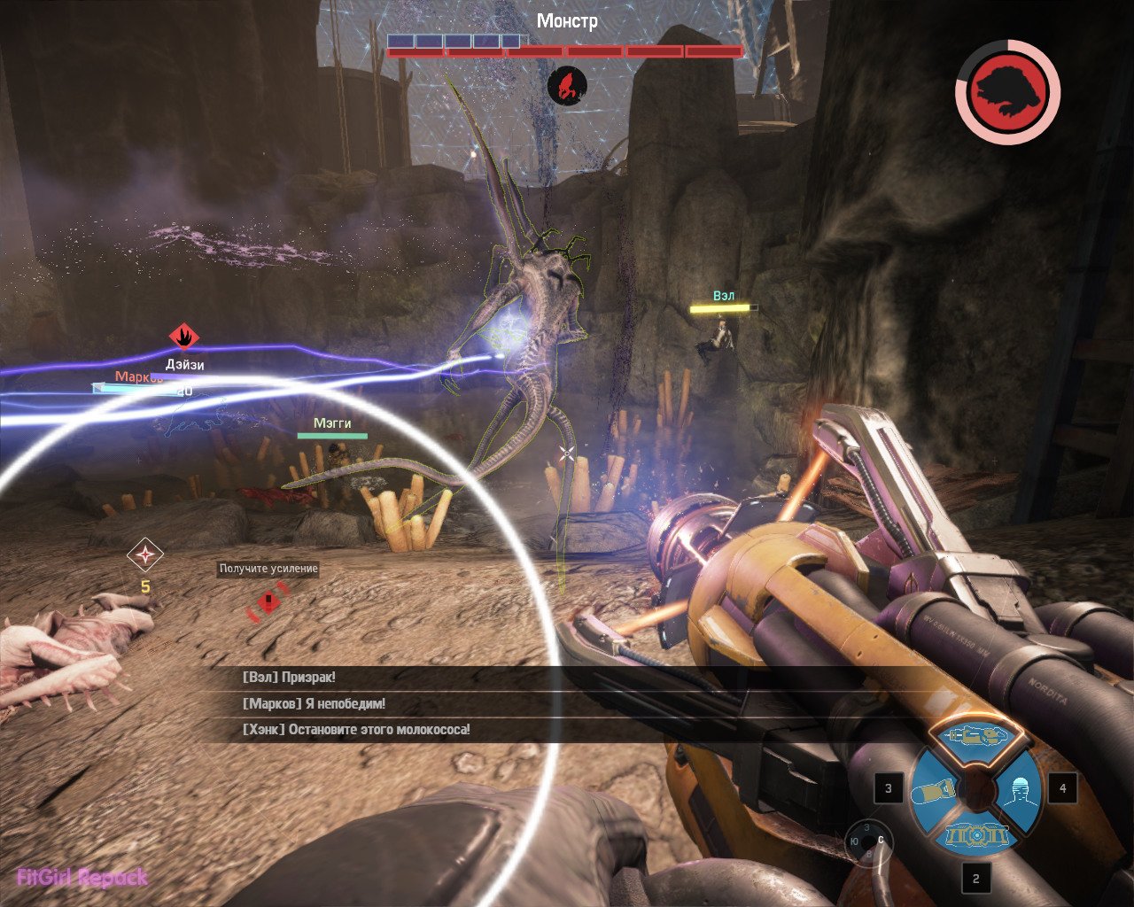 - Четыре на одного: уникальная система ролей для охотников и монстра с возможностью эволюции.