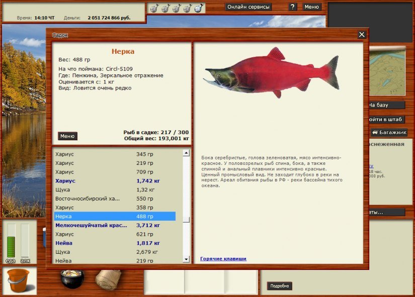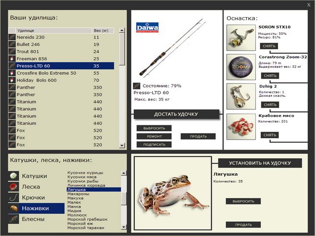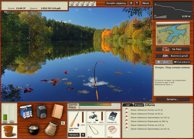 - Снасти и наживка. Используйте качественные удочки и разнообразную приманку, чтобы увеличить шанс поймать крупную рыбу. В таблице можно отслеживать общий вес улова.