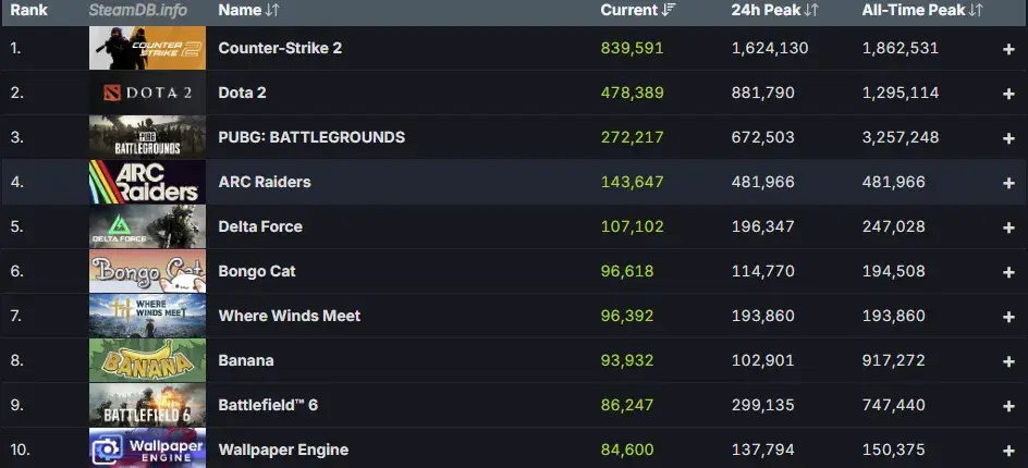 ARC Raiders снова побила собственный рекорд по количеству игроков в Steam. По данным SteamDB, в пиковый момент в игру одновременно зашли 482 тысячи человек — и это на фоне выхода таких крупных конкурентов, как Call of Duty: Black Ops 7 и Escape from Tarkov.
