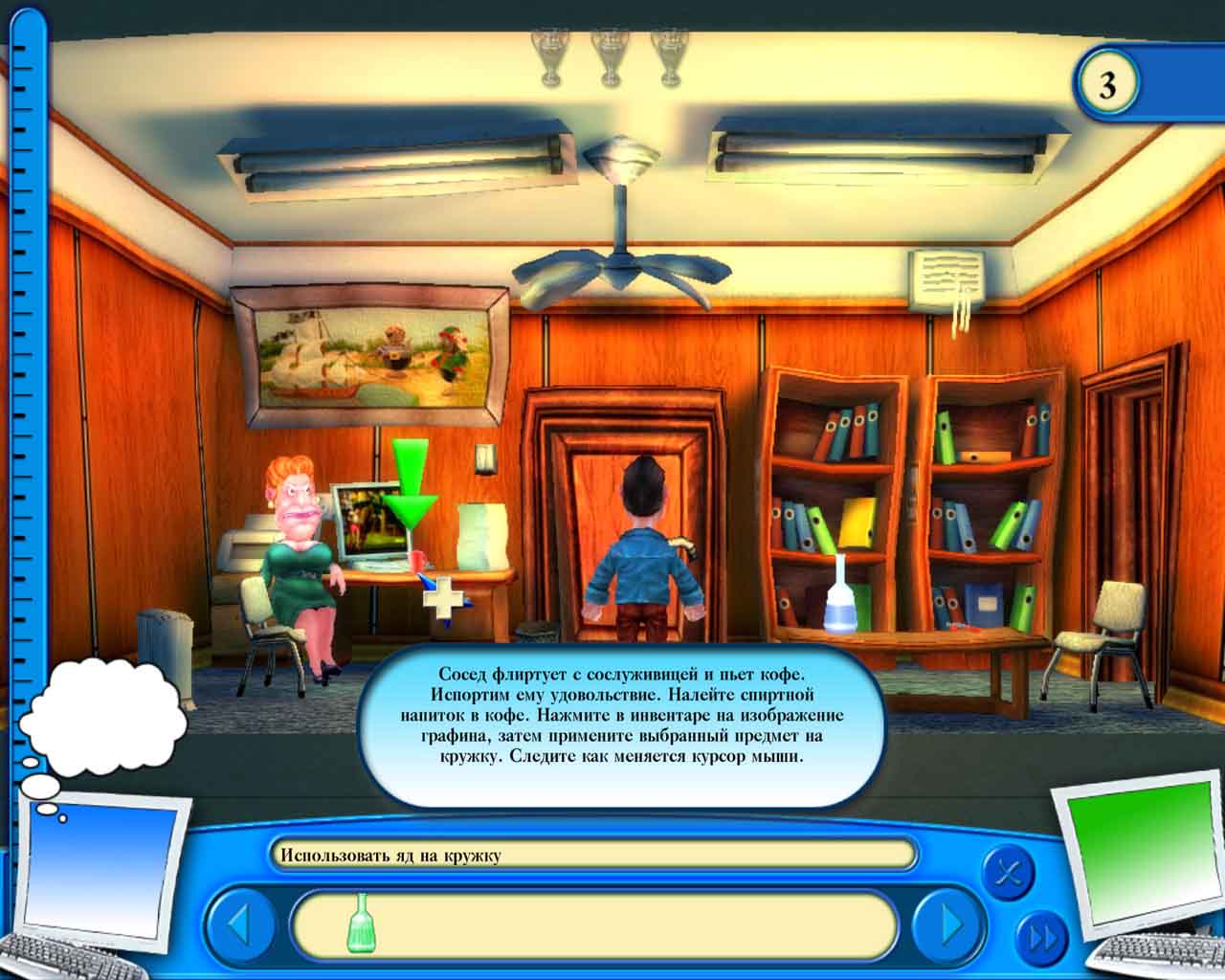 Рабочий стол шефа превращается в настоящий склад инструментов для шалостей: кнопки, клей, разнообразные бумаги, принтер и многое другое. Но действовать нужно осторожно — встреча лицом к лицу с начальником может закончиться провалом всей миссии. В офисе вас ждут десятки новых испытаний, и каждое из них потребует от вас внимательности и хитрости. Придумывая новые пакости, вы должны соблюдать осторожность, ведь любое необдуманное действие может привести к тому, что вас уволят.
