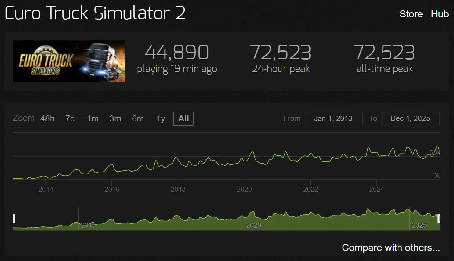 Обычно в ETS2 держится около 25 тысяч пользователей, но интерес резко вырос после выхода двух свежих дополнений — Nordic Horizons и Forest Machinery. До этого максимальный пик был зарегистрирован в октябре 2023 года, когда игру одновременно запустили более 69 тысяч человек.
