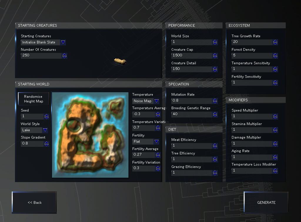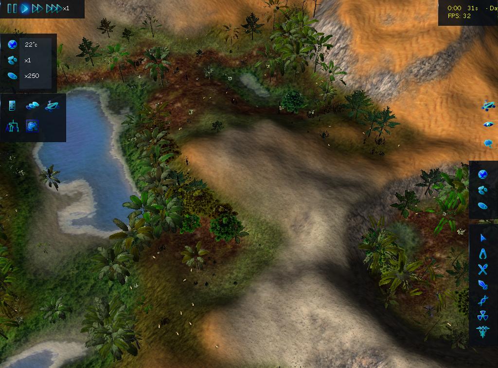 Этот проект представляет собой увлекательный симулятор эволюции, где игроки могут самостоятельно управлять развитием природы. Изначально доступна лишь частично пустая карта и несколько базовых инструментов. Постепенно, используя их, вы сможете создать полноценное поселение, одновременно обеспечивая условия для естественной эволюции окружающей среды.