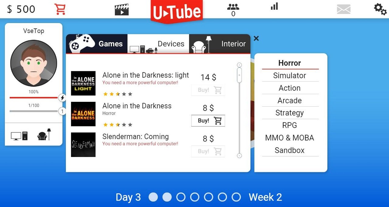 Помимо работы с контентом, важно заботиться и о бытовой стороне жизни персонажа. Придётся инвестировать в современный компьютер, качественную периферию и удобную мебель — всё это напрямую влияет на эффективность работы блогера. В игре Video Blogger Story на русском языке вы сможете создавать видео на самые разные темы: от политических и экономических обзоров до новостей и игровых роликов, получая за это бонусы и игровую прибыль.