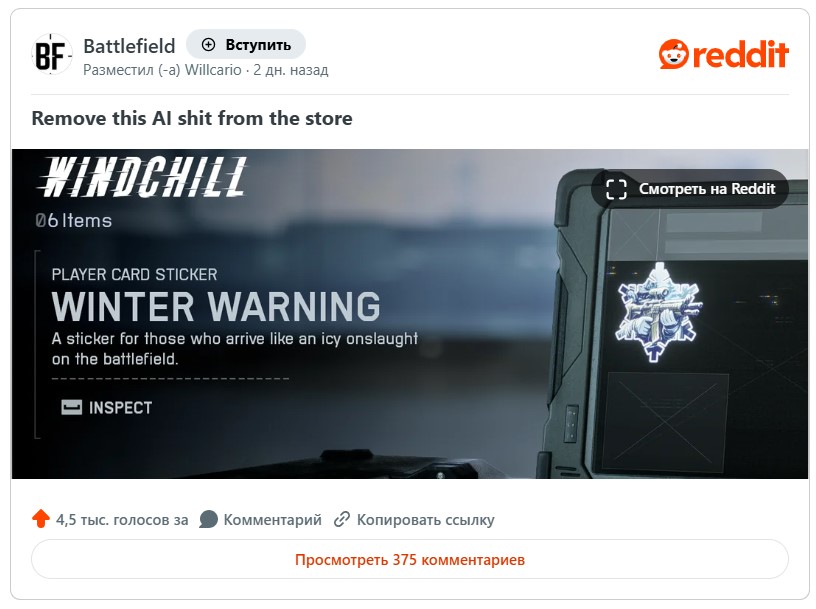 Ситуация вызвала негативную реакцию, поскольку ранее авторы Battlefield 6 публично заявляли, что не собираются использовать ИИ для создания арта. Некоторые игроки восприняли происходящее как нарушение обещаний. Вспомнили и недавний прецедент: из-за применения ИИ-изображений игру Expedition 33 лишили награды «Игра года» на The Indie Game Awards.